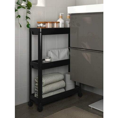 черный, чернаяСтеллаж, 36x23x100 см. **VESKEN вескен.** IKEA. Стеллаж поместится в самую маленькую ванную, решив при этом проблему хранения различных мелочей и туалетных принадлежностей, а также шампуней, мыла и кремов. Стеллаж легко собрать без инструментов - детали просто соединяются до щелчка. Эта удобная полка поможет Вам организовать пространство в любом помещении дома. Этажерка подойдет для кухни, для ванной, в туалет, как обувница в прихожую, для гостиной, для детской, для цветов и рассаду. Так же будет незаменима на даче, в саду или в офисе.