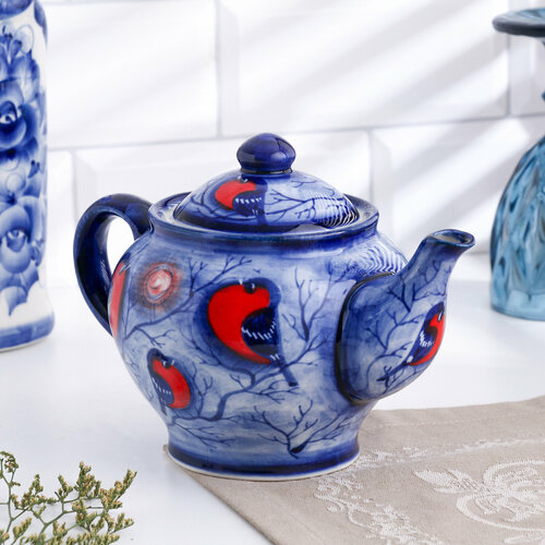Чайник "Уют", снегири, маленький, 14 х 14 см, гжель