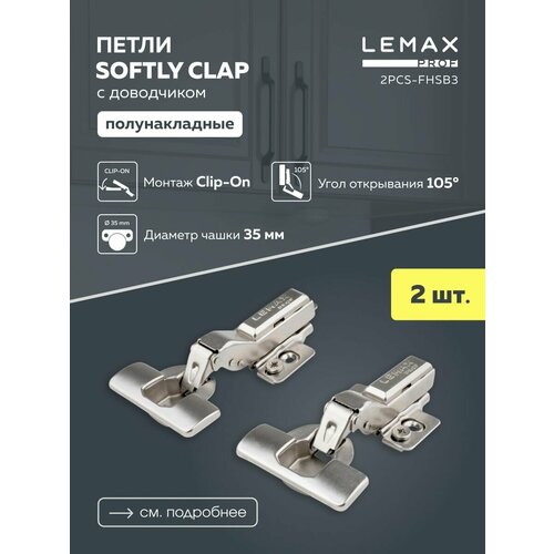 Петли мебельные полунакладные Lemax Prof с доводчиком 105 градусов 3D-регулировка Clip-On, сталь, цвет никель, 2 шт