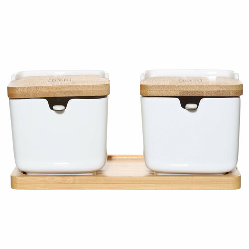 Банка для сыпучих продуктов, 250 мл, 2 шт, на подставке, с ложками, керамика/бамбук, Keep