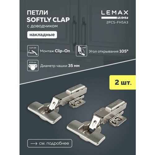 Петли мебельные накладные Lemax Prof с доводчиком 105 градусов 3D-регулировка Clip-On, сталь, цвет никель, 2 шт
