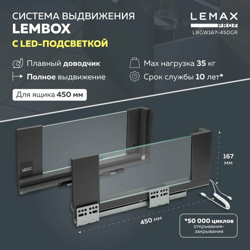 Система выдвижения ящиков Lembox со стеклянными боковинами и LED-подсветкой Lemax prof / Шариковые направляющие с доводчиком для сборки 1 ящика 450 мм / Цвет