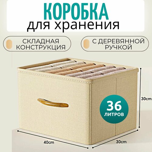 Складной тканевый короб для хранения вещей, 40х30х30 cм. с деревянной ручкой от AVINHOME. Бежевая рогожка. Коробка складная, жесткая
