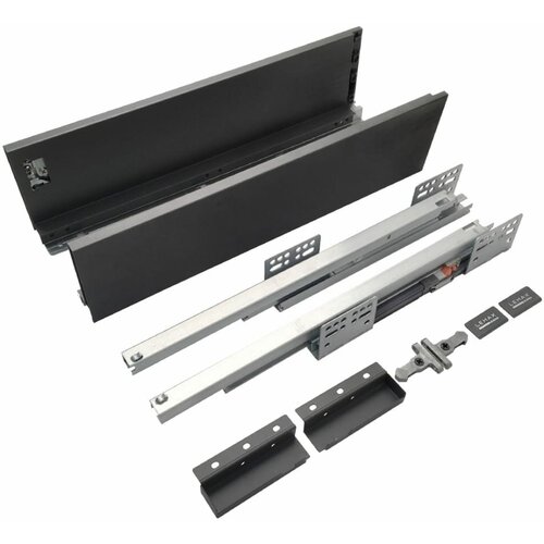 Комплект поставки включает: направляющие скрытого монтажа (2 шт.); боковые стенки (2 шт.); коннекторы для крепления фасада (2 шт.); коннекторы для крепления задней стенки (2 шт.).