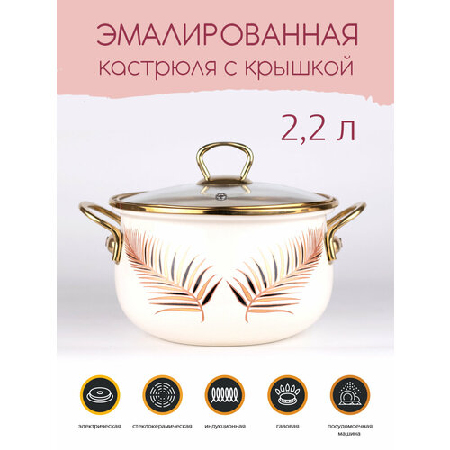 Кастрюля эмалированная Ø16см, 2,2л, Листья, крышка - стекло, Катюша, арт. 4020-220-0