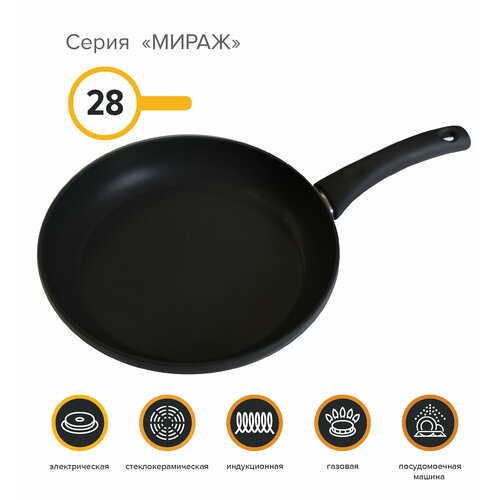 Серия "Мираж" - это алюминиевая посуда с экологически безопасным многослойным покрытием. Толщина стенок - 2,7 мм. Дно – индукционное. Ручка – бакелитовая с покрытием Soft Touch. К данной сковороде подходит любая крышка диаметром 26см. Для всех типов плит. Можно мыть в ПММ.