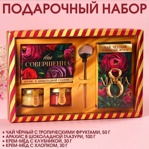 Набор «Ты совершенна»: крем-мёд с клубникой и хлопком 30 г. х 2 шт, арахис в шоколадной глазури 100 г, чай чёрный с тропическими фруктами 50 г, ложка (комплект из 3 шт)