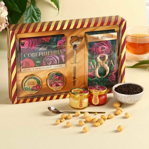 Набор "Ты совершенна": крем-мёд с клубникой и хлопком 30 гр x 2 шт, арахис в шоколадной глазури 100 гр, чай чёрный с тропическими фруктами 50 гр, ложка