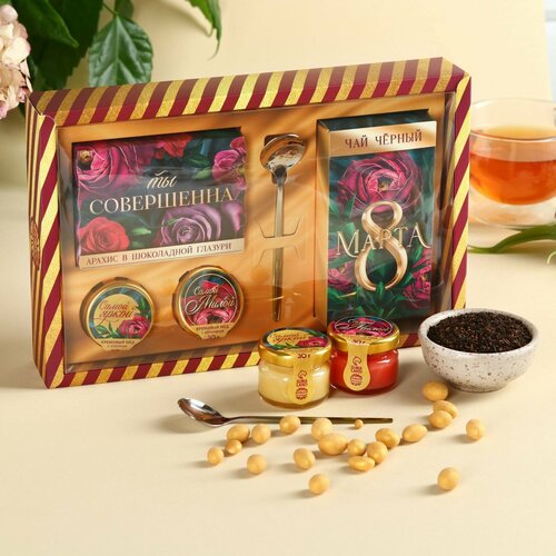 Набор «Ты совершенна»: крем-мёд с клубникой и хлопком 30 г. х 2 шт, арахис в шоколадной глазури 100 г, чай чёрный с тропическими фруктами 50 г, ложка