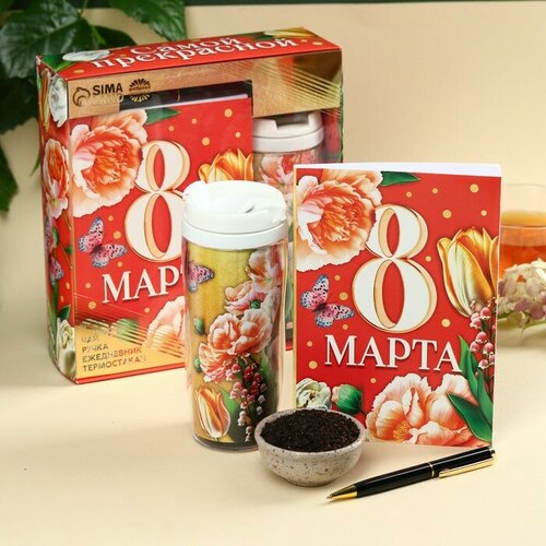 Набор «Самой прекрасной»: чай чёрный со вкусом ваниль и карамель 20 г, термостакан 350 мл, ежедневник 80 листов, ручка (комплект из 3 шт)