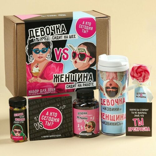 Гифтбокс «Девочка VS Женщина»: шоколад 20 г (4 шт. х 5 г), чай чёрный с фруктами 50 г, леденец со вкусом малины 15 г, драже с какао 80 г, термостакан 350 мл.