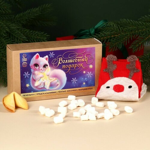 Фабрика счастья Минигифтбокс «Волшебный подарок»: печенье с предсказанием 3 шт, маршмеллоу 30 г, носки 36-39 размер