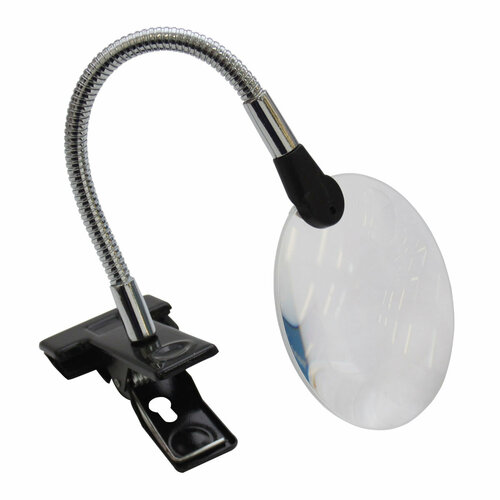 Пластиковая лупа на гибком металлическом штативе. Штатив позволяет регулировать положение линзы под желаемым углом. Без встроенной подсветки. С помощью прищепки лупу можно зафиксировать на крае стола, рамке для вышивания и другой рабочей поверхности. Лупа подходит для вышивки нитками или бисером, плетения, сборки механизмов или конструкторов, изготовления бижутерии и другой мелкой работы.