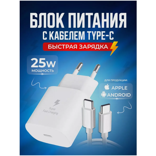 Быстрая зарядка 25W / Сетевое зарядное устройство для Samsung, Xiaomi, Oppo / Кабель Type-C в комплекте / Белый