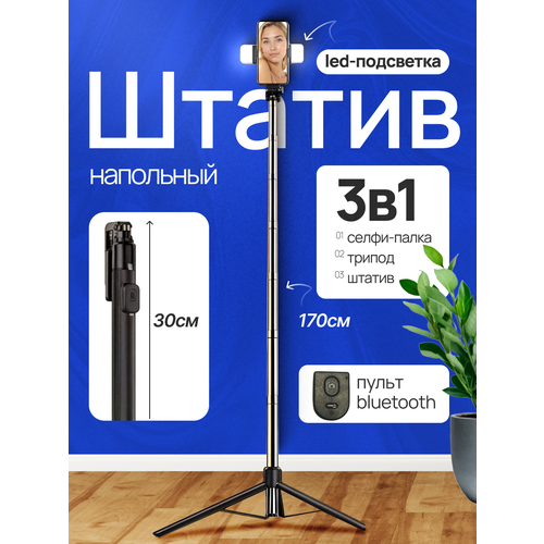Штатив для телефона, настольный, напольный с 1 лампой, 1.7 м, панорамная съемка. Селфи палка для смартфона, с пультом управления.
