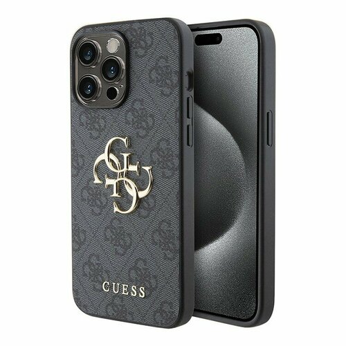 Guess для iPhone 15 Pro Max чехол PU кожа с принтом 4G и Big metal logo, серый