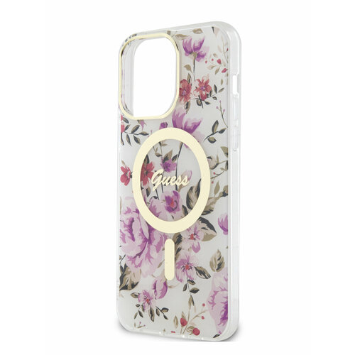 Guess для iPhone 15 Pro Max чехол PC/TPU Flower Hard Transp/Gold (MagSafe)