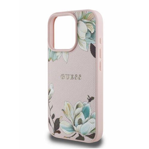 Guess для iPhone 16 Pro Max чехол PU Grained leather Flowers Metal logo Hard Pink (MagSafe)