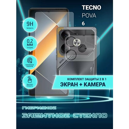 Защитное стекло для Tecno Pova 6 на экран и камеру, гибридное (пленка + стекловолокно), Crystal boost