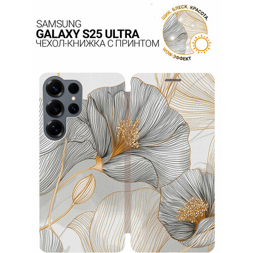 Чехол-книжка на Samsung Galaxy S25 Ultra с принтом "Волшебный танец света в лепестках" золотой
