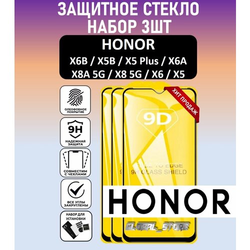 Комплект 3 в 1: Защитное стекло для HONOR X6b / X6 / X6a / X5 Plus / X8a 5G ( 3 шт ) Хонор Икс 6а / Икс 6 / Икс 8а 5Г стекло с рамкой Full Glue