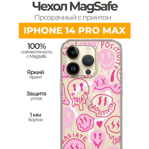 Чехол на Айфон 14 Про Макс MagSafe с магнитом с принтом "Галлюциногенные смайлики"