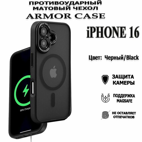 Матовый чехол для iPhone 16 ( Айфон 16) с защитой камеры ARMOR CASE черный противоударный с MagSafe