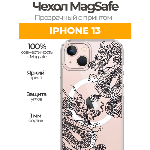 Чехол на Айфон 13 MagSafe с магнитом с принтом "Два китайских дракона"