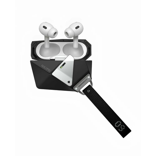 Чехол на Airpods Pro 2 (и 1) защитный, Aulumu A09 Geometric Case, ремешок, черный