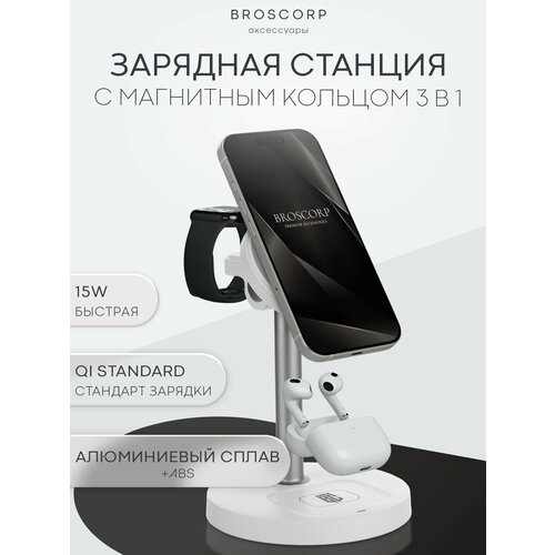 Беспроводная зарядка iPhone с магнитным кольцом 3 в 1, бренд Broscorp, белая