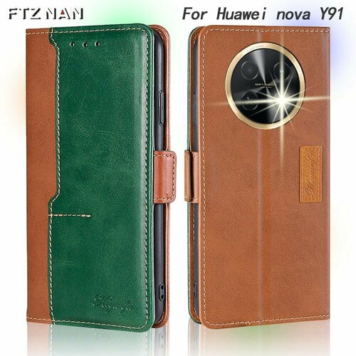 Подходит для чехол-книжка на Huawei Nova Y91 (Хуавей Нова У91), противоударный, с магнитом, (коричневый+зеленый)