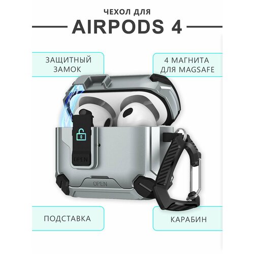 Чехол для наушников AirPods 4 (2024) MagSafe, с подставкой, с магнитным замком и карабином, пластик, серебристый