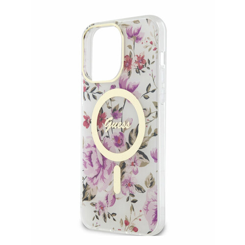 Guess для iPhone 15 Pro чехол PC/TPU Flower Hard Transp/Gold (MagSafe)