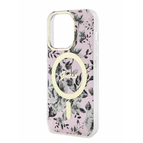 Guess для iPhone 15 Pro чехол PC/TPU Flower Hard Pink/Gold (MagSafe)