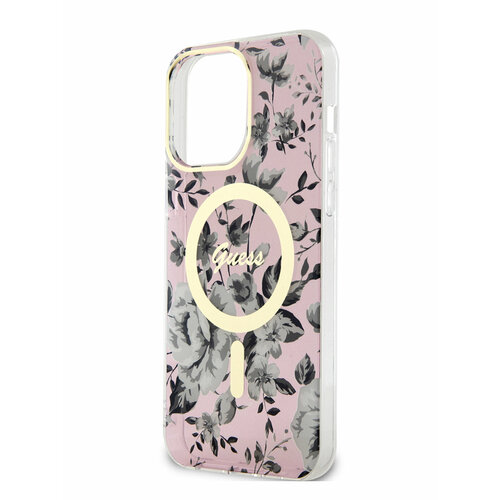 Guess для iPhone 15 Pro Max чехол PC/TPU Flower Hard Pink/Gold (MagSafe)