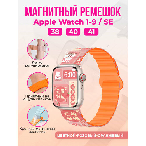Магнитный силиконовый ремешок для Apple Watch 1-9 / SE (38/40/41 мм), цветной-розовый-оранжевый
