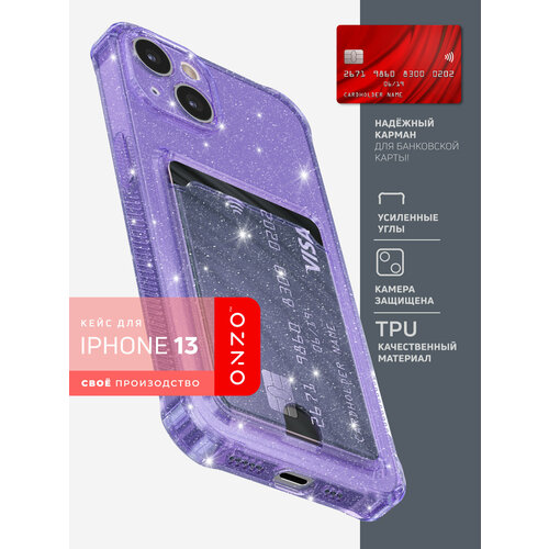 Чехол на Айфон 13 противоударный с карманом для карт прозрачный фиолет Very Peri с блестками iPhone 13 чехол