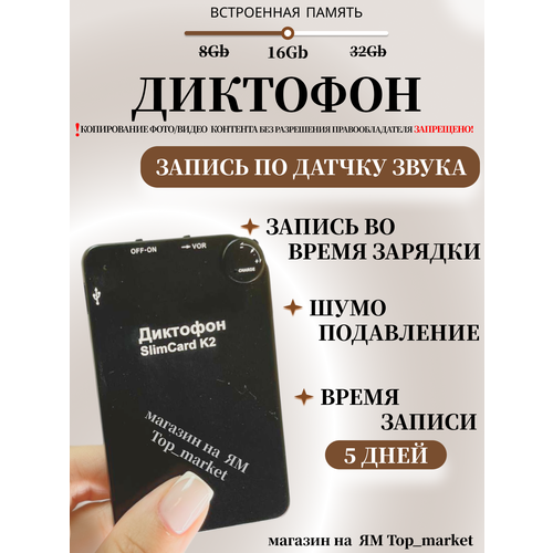 Ультратонкий диктофон SLIM CART-k2 память 16GB запишет непрерывно до 5 дней, датчик звука, шумоподавление