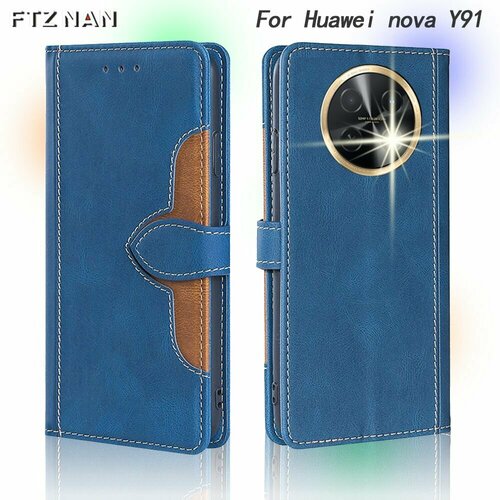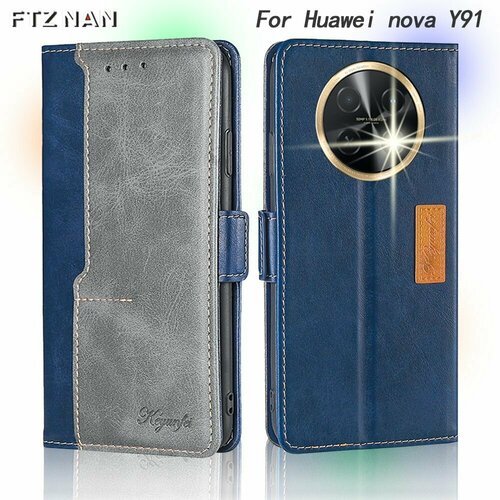 Чехол-книжка с для Huawei Nova Y91/ чехол кожи на Хуавей Нова У91, Новый, флипом, противоударный, (синий+светло-коричневый)