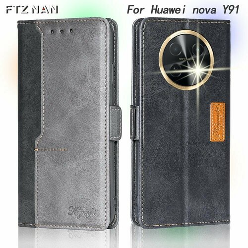Подходит для чехол-книжка на Huawei Nova Y91 (Хуавей Нова У91), противоударный, с магнитом, (черный+серый)