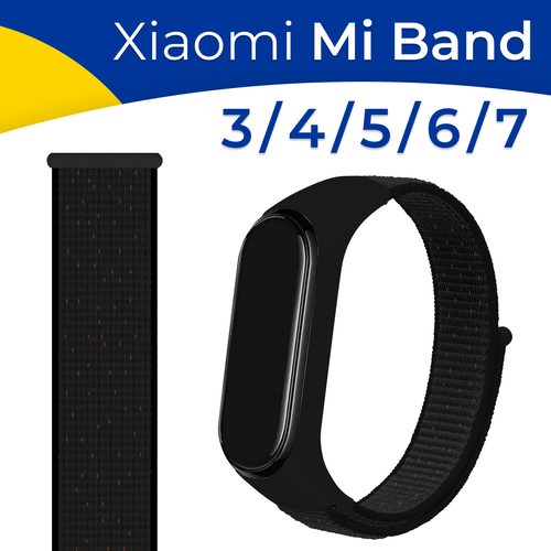 Нейлоновый ремешок для фитнес-трекера Xiaomi Mi Band 3, 4, 5, 6 и 7 / Тканевый браслет на смарт часы Сяоми Ми Бэнд 3, 4, 5, 6, 7 / Черно-оранжевый