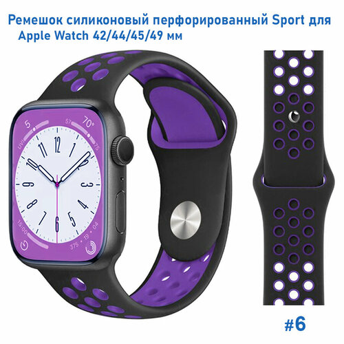 Ремешок силиконовый перфорированный Sport NK для Apple Watch 42/44/45/49 мм, на кнопке, черный+фиолетовый (6)