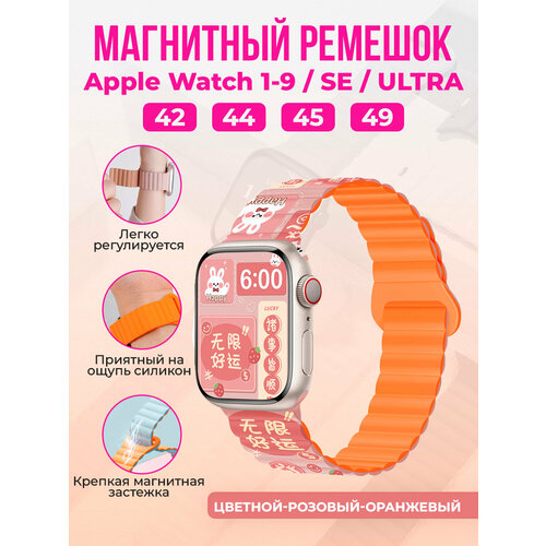Магнитный силиконовый ремешок для Apple Watch 1-9 / SE / ULTRA (42/44/45/49 мм), цветной-розовый-оранжевый