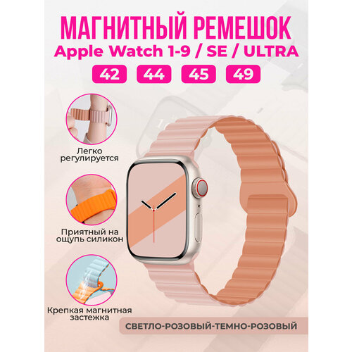 Магнитный силиконовый ремешок для Apple Watch 1-9 / SE / ULTRA (42/44/45/49 мм), светло-розовый-темно-розовый