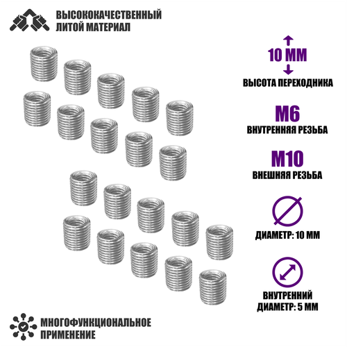 Резьбовая гайка переходник с внешней резьбой М10 и внутренней резьбой М6, высота 10 мм, 20 шт