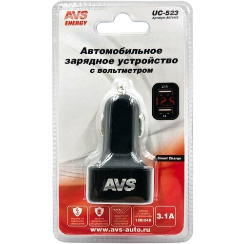 AVS A07444S Устройство зарядное автомобильное USB AVS 2 порта UC-523 (3А,) с вольтметром AVS A07444S