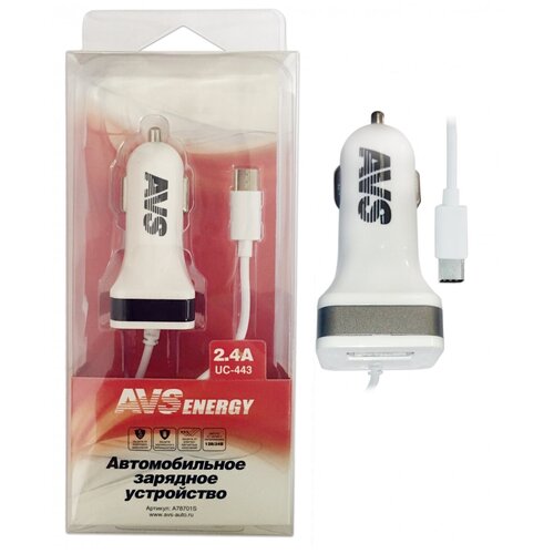 Usb автомобильное зарядное устройство Avs 1 порт+ type c uc-443 (2,4а) Avs A78701S