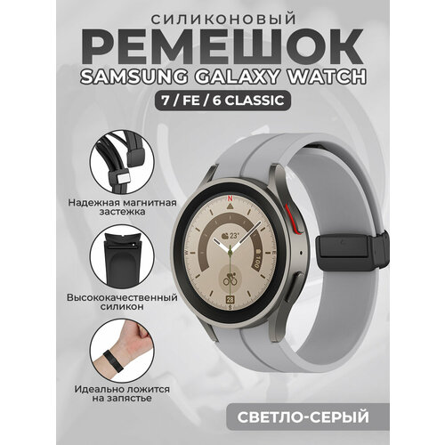 Силиконовый ремешок для Samsung Galaxy Watch 7 / FE / 6 Classic, с черной магнитной застежкой, светло-серый