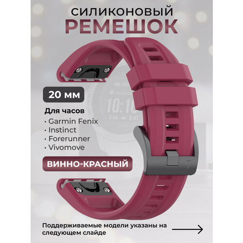 Силиконовый ремешок для Garmin Fenix / Instinct / Forerunner / Vivomove, 20 мм, c металлическим фиксатором и баклей, винно-красный