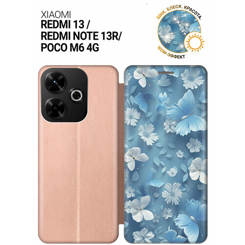Чехол-книжка на Xiaomi Redmi 13 / Redmi Note 13R / Poco M6 4g с принтом "Голубые бабочки" золотой